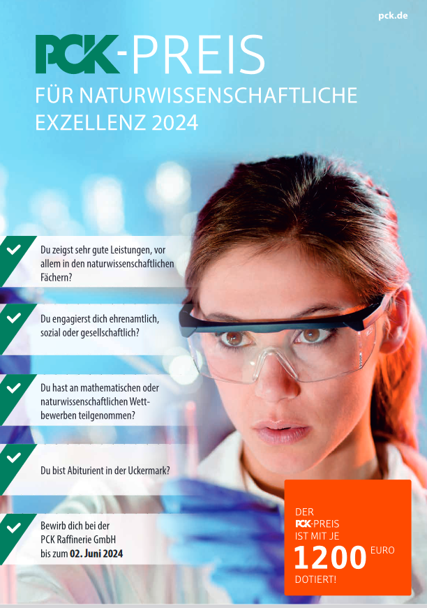 Die PCK Raffinerie GmbH möchte die Lernkultur in der Uckermark verbessern und das Interesse junger Menschen an Naturwissenschaften fördern. Das Unternehmen vergibt deshalb jährlich Preise an Abiturienten aus uckermärkischen Gymnasien bzw. Gesamtschulen mit gymnasialer Oberstufe. PCK würdigt damit Schüler/-innen, die hervorragende Lernergebnisse auf naturwissenschaftlichem Gebiet haben und sich gesellschaftlich oder sozial in einem hohen Maß engagieren.